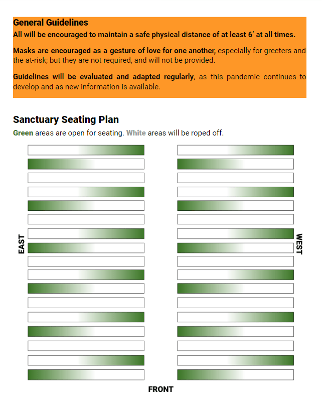 We still advise and urge, as we always have, that if you are elderly, or immune-compromised, or fearful, to please stay home and worship with us in Spirit (if not presence).
